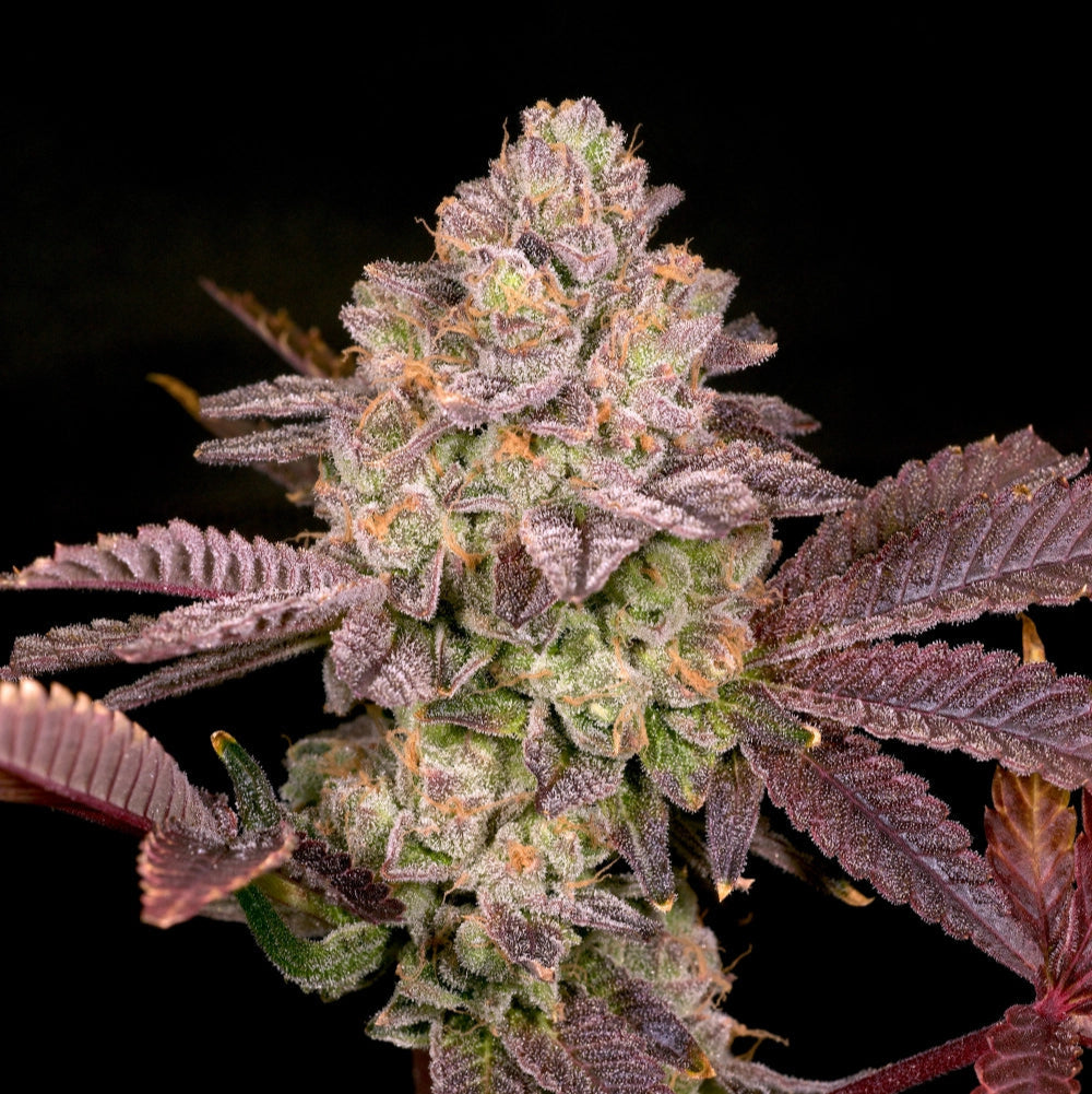 Glow she does. The Moonbow #112, a multiple award and cannabis cup winning selection, produces stunning progeny. This proprietary selection never disappoints with her blackberry jam, zkittles soaked, zingy skunky kush aroma and perfectly balanced flavor of candy and petrol. The Planet Purple #144 male adds a bit earthier, kushier, sunset sherbert red wine/gelato runtz note to the progeny, while improving the resin content and bag appeal of the Moonbow #112. Not that either parent is lacking in those departments. Colorful plants with long stacked running colas will fill your canopy with juicy sweet earthy diesel zkittles terps on strong well branched plants. Our favorite phenotypes lean to the Moonbow side but with a unique fizzy funk to the flowers. An excellent hashmaker’s variety, with some phenotypes easily pushing past 6% yield on fresh frozen material.